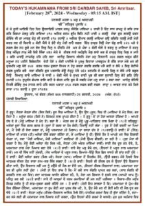 अमृत वेले हुक्मनामा श्री दरबार साहिब, अमृतसर, भाग 686, दिनांक 28-02-2024