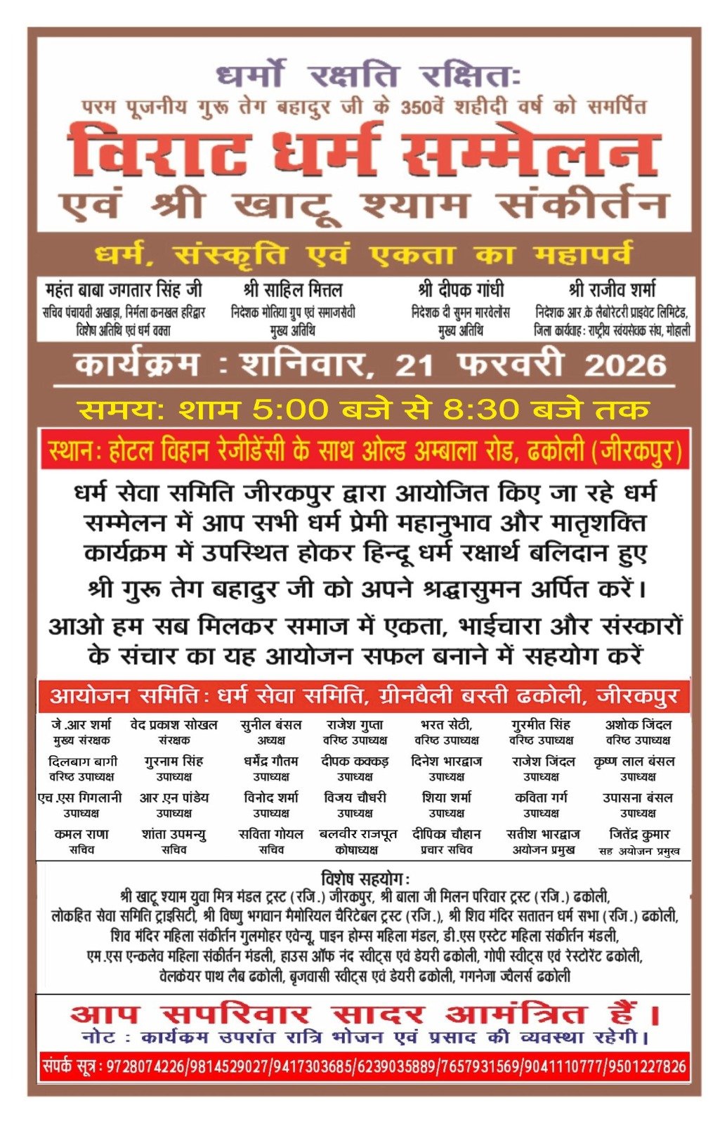 “गुरु तेग बहादुर जी के 350वें शहीदी वर्ष को समर्पित विराट धर्म सम्मेलन एवं श्री खाटूश्याम संकीर्तन – ढकोली में भव्य आयोजन”