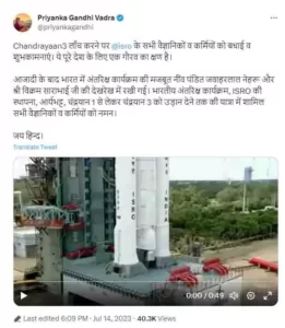 आज इसरो के वैज्ञानिकों द्वारा Chandrayaan3 लॉन्च करने पर प्रियंका गांधी ने ट्वीट पर बधाई दी।