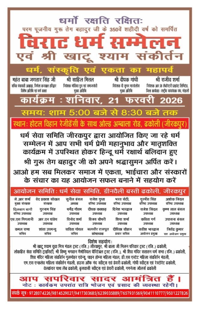 धर्म सेवा समिति ग्रीनवैली बस्ती जीरकपुर द्वारा परम पूजनीय गुरु तेग बहादुर के 350वें शहीदी वर्ष को समर्पित एक विराट धर्म सम्मेलन एवं श्री खाटूश्याम संकीर्तन का 21 फरवरी शनिवार को ओल्ड अम्बाला रोड डी. एस एस्टेट सोसायटी ढकोली के गेट नंबर 1 पर आयोजन किया जा रहा है.