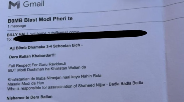 धमकी भरी मेल में कहा गया है कि डेरा सच्चखंड बल्लां और संत निरंजन दास जी से इसका कोई लेना देना नहीं है सिर्फ मोदी को लेकर है। यह बदला है निज्जर के लिए, जिसकी कनाडा में गोलियां मार कर हत्या कर दी गई थी। मोदी खालिस्तान का दुश्मन है।